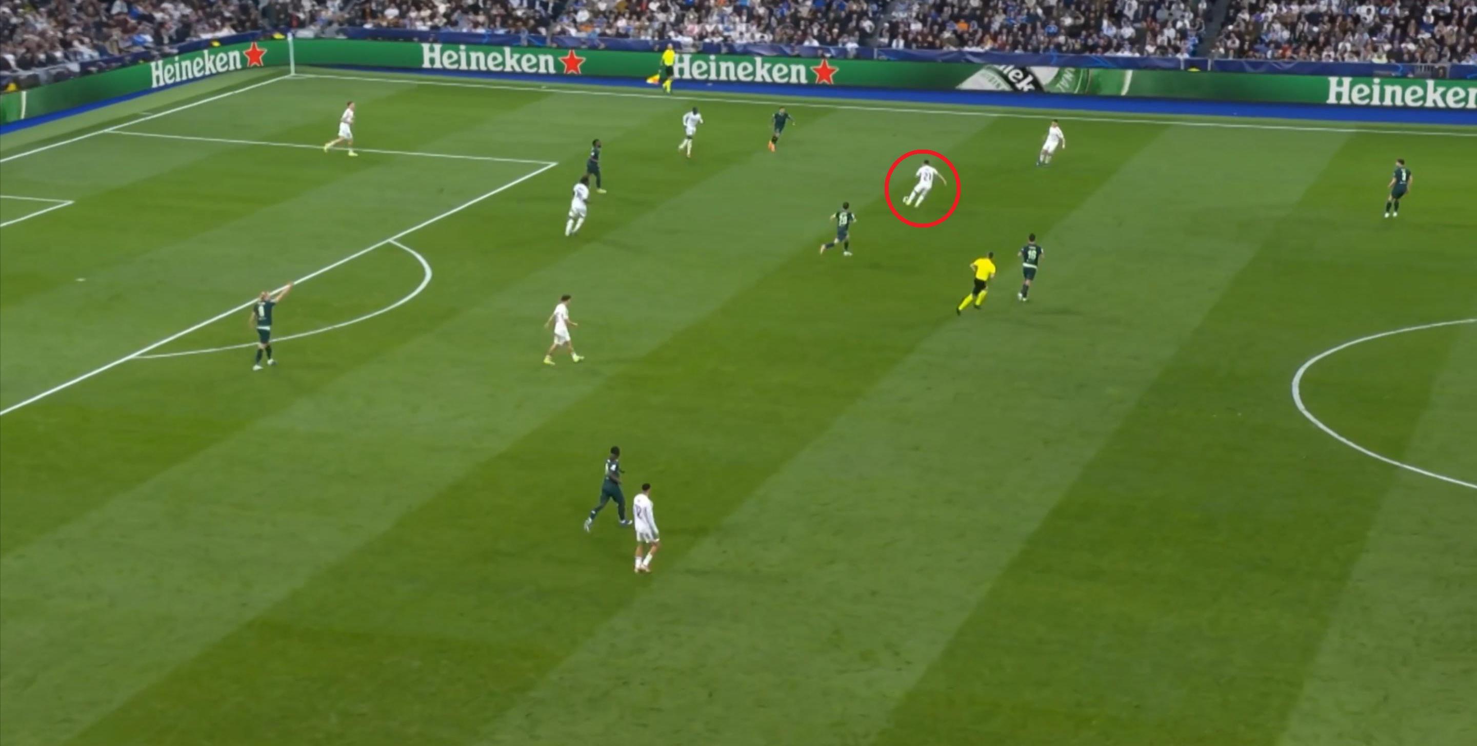 所以在下半场,皇马的表现依然稳健,还是通过人数足够的防守来构筑基础,在此之上进行次数有限,但威胁不小的反击,效果依然不错: