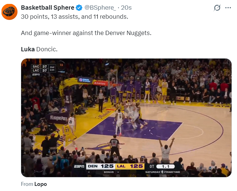 加时赛东契奇手感不佳连续两投不中,但绝杀球雷迪克还是给了他,他在终场前1.1秒面对琼斯翻身后仰出手命中,只给掘金留下0.5秒,掘金已经没有暂停,最终东契奇完成了准绝杀。